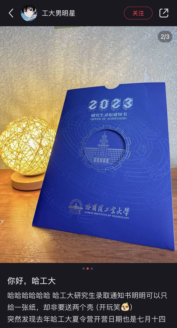 录取通知书是小红书同款:晒出的"哈工大录取通知书"竟能在小红书找到一模一样的模板,连光影角度都懒得改,这是把中国顶尖航天名校的文凭当**"网红拍照道具"**?