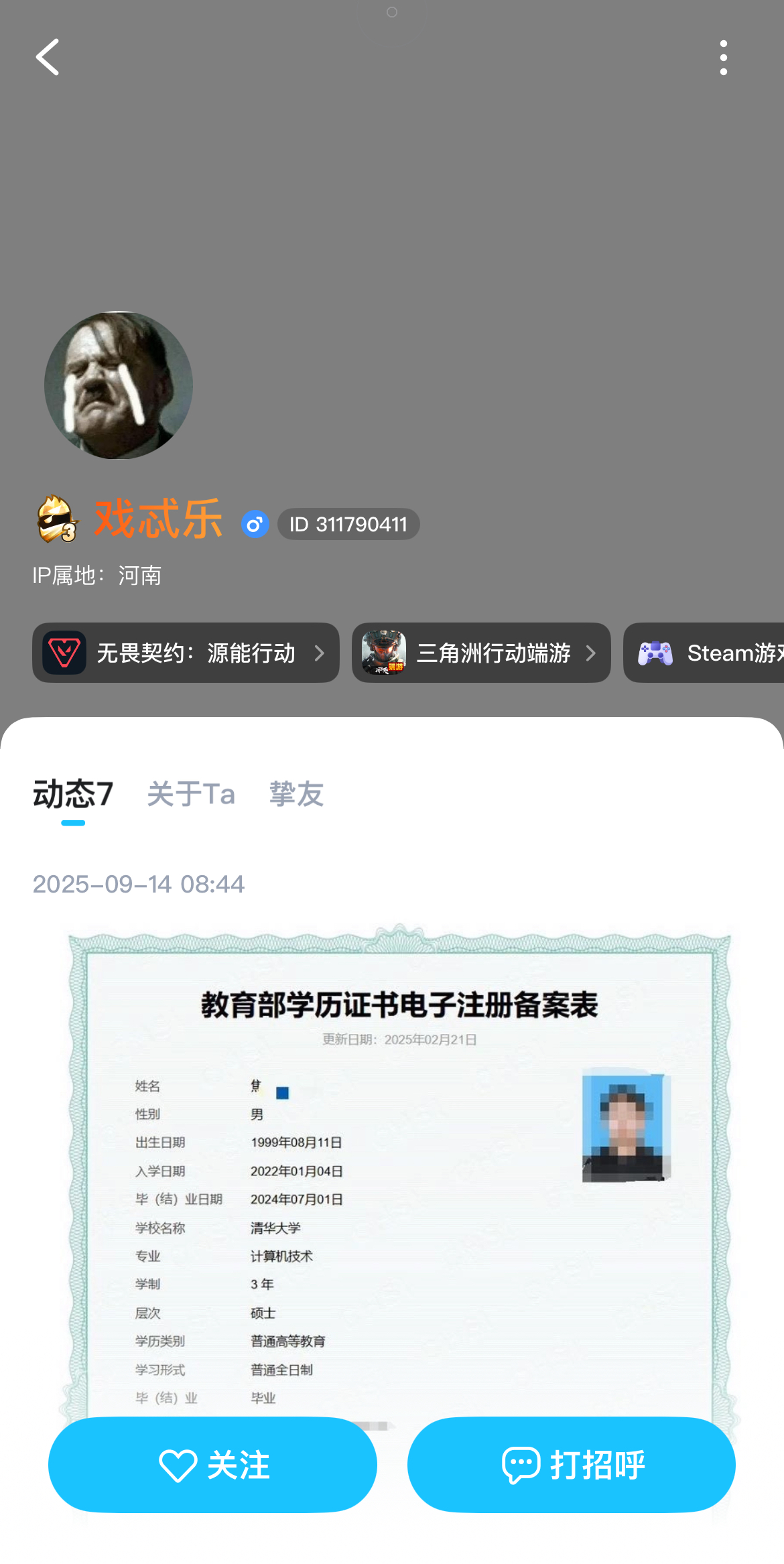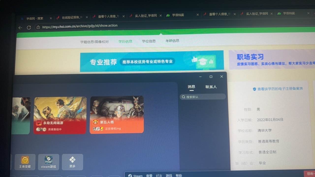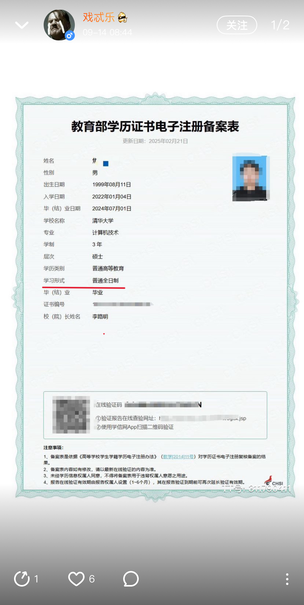 动态发的学信网图片是清华大学硕士学位,但是图没有改好,学习形式显示为普通全日制。